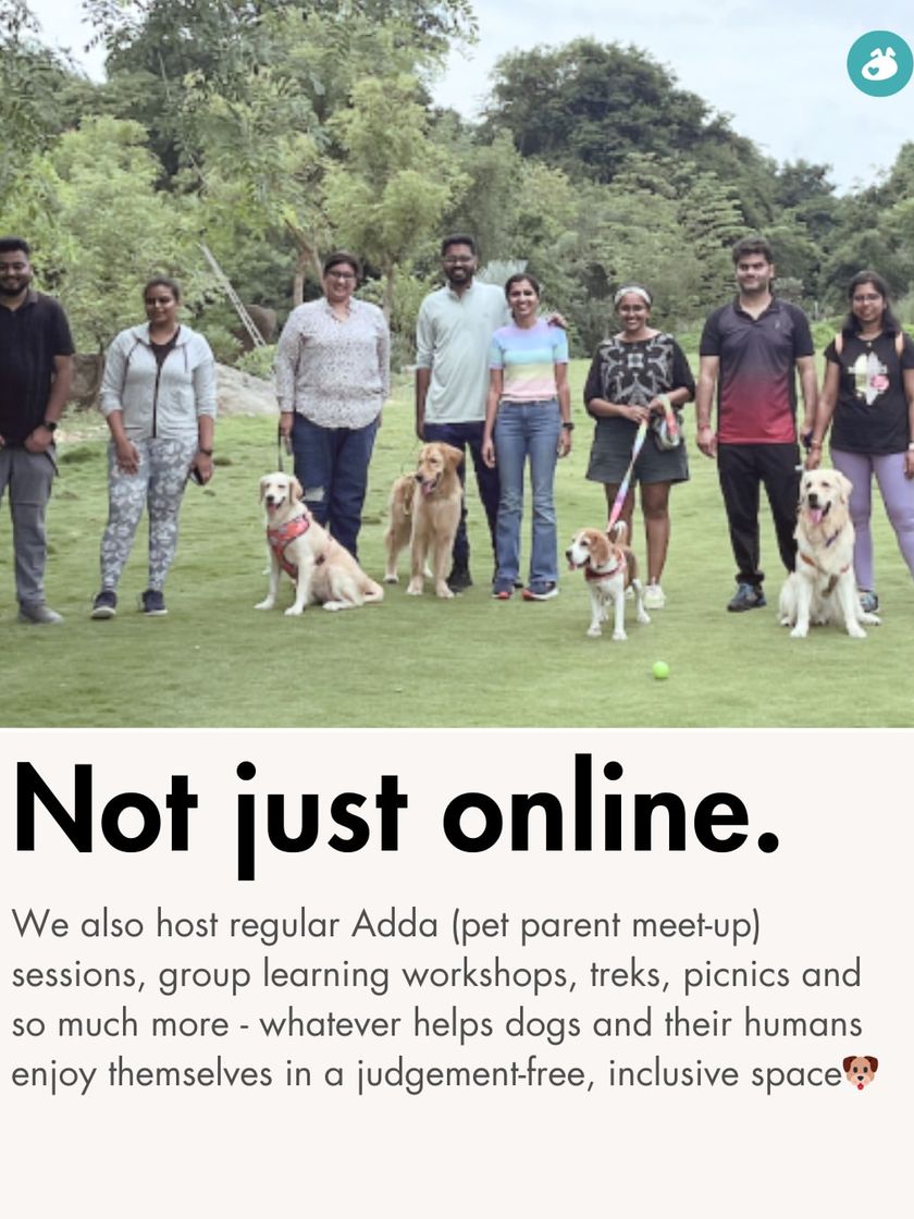 This is where our online community comes to life. We organize regular offline meet-ups, from city-based 'Addas' and picnics to adventurous group treks, creating a safe and inclusive space for dogs and their parents to socialize, learn, and have fun together.