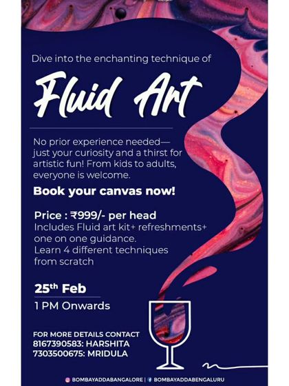 - Fluid art workshop Bangalore: We play with colors and techniques, letting paint flow however it wants. The results are always unique.