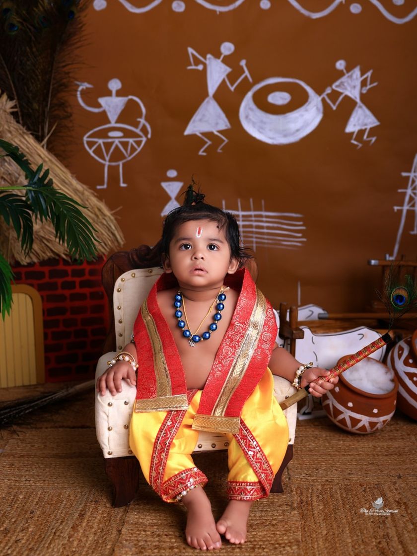 We create divine portraits of your little one as Bal Gopal for the holy festival of Janmashtami. Our studio is equipped with traditional backdrops, costumes, and props like flutes and matkis to capture the playful and innocent spirit of Kanha.
