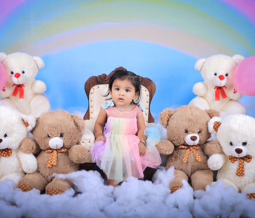 Let your child's imagination run wild with our creative studio photoshoots. We have a wide range of themes available, from musical setups with a mini piano to dreamy rainbow clouds with teddy bears, ensuring a fun and unique experience.