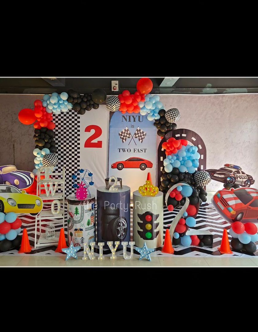 For kids with a need for speed, I design high-energy racing themes. Whether it's a 'Two Fast' party, a Disney Cars adventure, or a Hot Wheels rally, these setups are packed with checkered flags, race tracks, and traffic light details to get the party started.