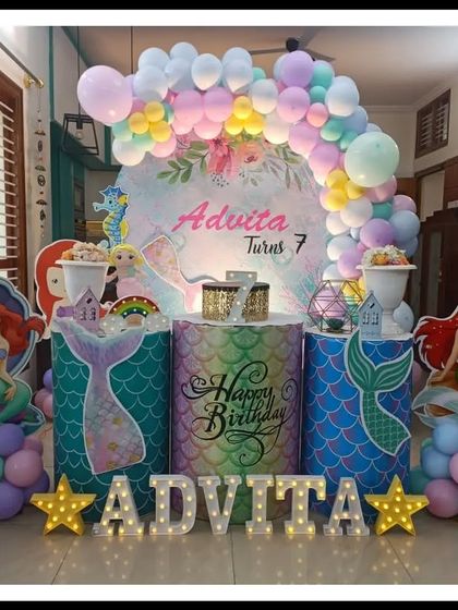 I create magical underwater celebrations with mermaid, ocean, and sea animal themes. These parties are filled with iridescent colors, shimmering backdrops, and charming sea creature cutouts like dolphins, octopuses, and of course, Ariel the Little Mermaid.