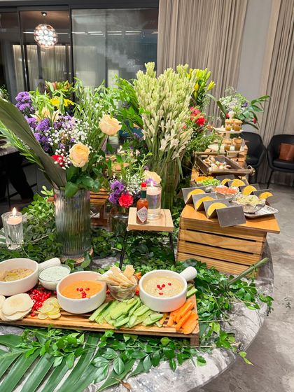 We create stunning grazing tables featuring artisanal assortments of cheeses, crackers, fruits, and sliced meats with Lebanese, Italian, and Mexican influences. Our tables are styled with fresh flowers, greenery, and rustic wooden crates for an elegant presentation.
