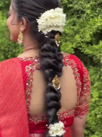 I provide complete hair styling services to match your makeup and attire. This includes traditional South Indian braids (jadai) with fresh flowers and ornaments, as well as modern updos, elegant buns, and romantic open hairstyles for different events. I ensure every style is secure and stays perfect throughout your celebration.