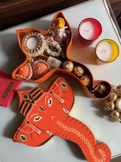 Boxes are never boring here. You might get fabric wraps, jute baskets, quirky house shapes, or Ganesha boxes for that proper festive vibe. Inside, it’s all about goodies I actually curate myself - gourmet snacks, sweets, candles, perfumes, diyas, torans, you name it.