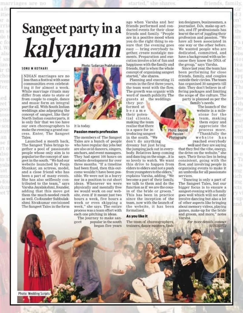 I am overjoyed to have my passion for sangeet recognized by leading publications like The New Indian Express and The Bangalore Times. These features are a testament to my team's hard work and our unique approach to creating modern, joyful wedding celebrations.