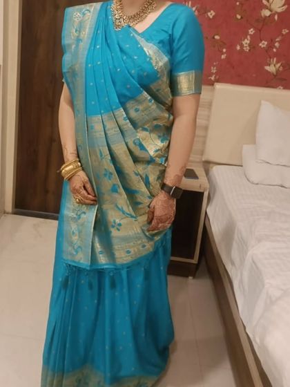 We handle various regional draping styles beyond the classic South Indian look. This includes pre-pleating for Maharashtrian weddings (Shalu) and the front-pallu Gujarati style, all prepared for your convenience.