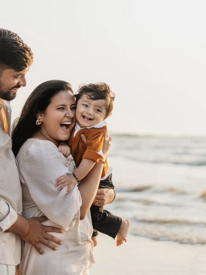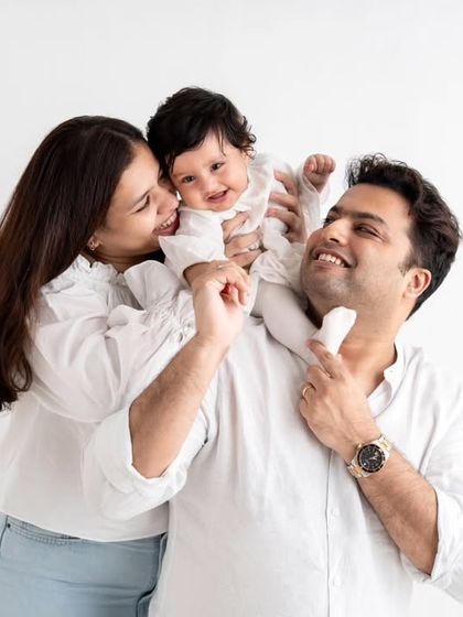 We photograph your baby’s milestones like sitting, giggling, and first steps in our Mumbai studio with all props and outfits provided, and family can join in too.