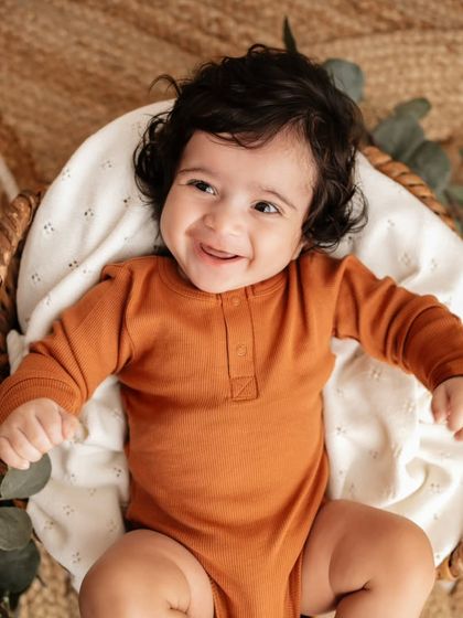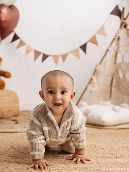 My studio in Mumbai is like a little playground - I love boho milestone baby sessions with soft, earthy props, but I also do clean, minimalist looks or fun themes (clouds, little bakers, you name it). We can step outside too if you want natural light baby portraits with a garden vibe.