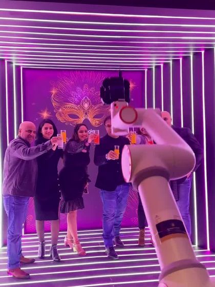 I call it the SnapBot - not your typical video booth. This is a robotic arm that glides around you, capturing those filmy slow-motion shots you see at big award shows. It's all about making you feel like a star, minus the red carpet pressure.