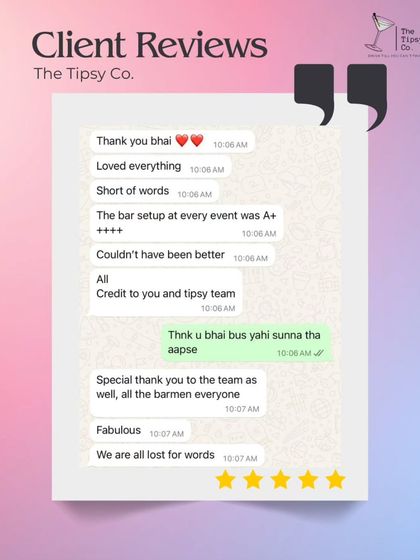 We’re The Tipsy Co. Not just your regular bartenders—more like your party’s secret sauce. We live for those post-event texts, 'Thank you bhai, everyone was smashed!' That’s our real trophy. Sure, we’ve bagged gold for trendsetting bar menu design three years straight, but it’s the wild energy of our crew, from Mumbai to Zanzibar, that makes every pour special. Every event, big or small, is a new adventure for us.