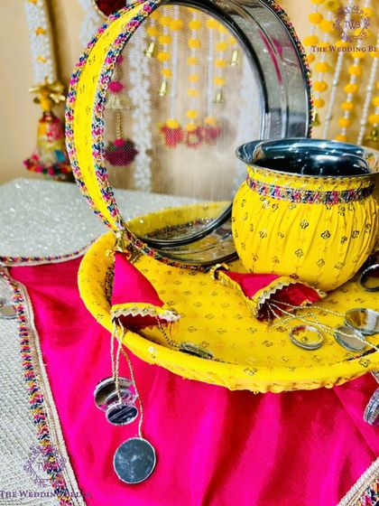 - Intricately detailed Karvachauth thali sets with luxury embellishments