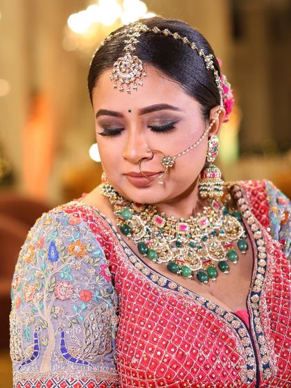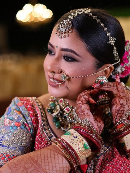 We provide complete bridal styling solutions combining professional makeup, hair styling, and outfit coordination. Our approach emphasizes traditional Indian bridal looks featuring bold eyes and soft lips, while ensuring the overall style aligns with contemporary trends.