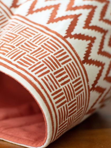 - Block-printed fabric baskets give soft but sturdy storage for magazines, throws, or kids’ stuff.