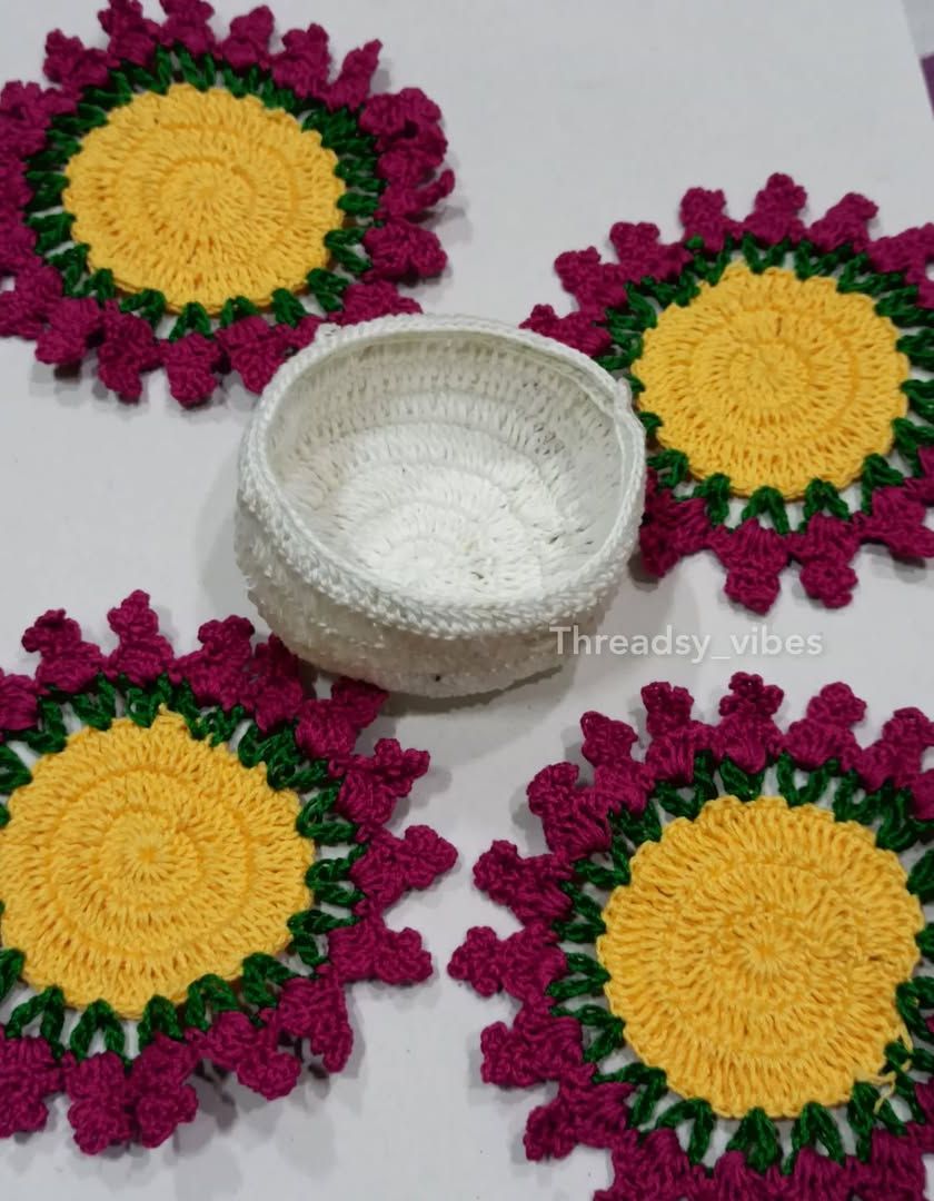 I love making little things that add color and coziness to any corner. Here you'll find my handmade floral coasters, decorative 3D flowers, and custom covers for things like your namak dani. Each piece is made with lots of love and yarn 🧶.