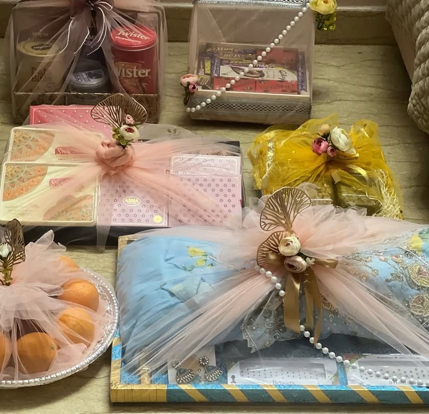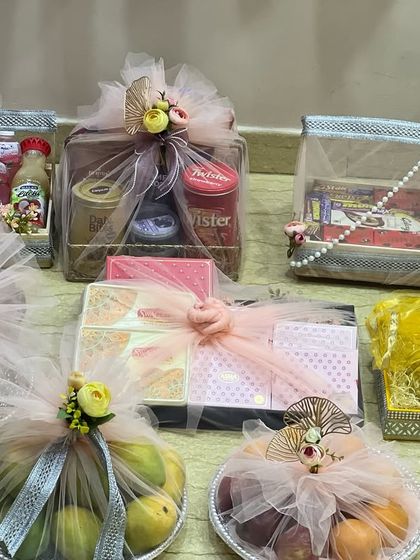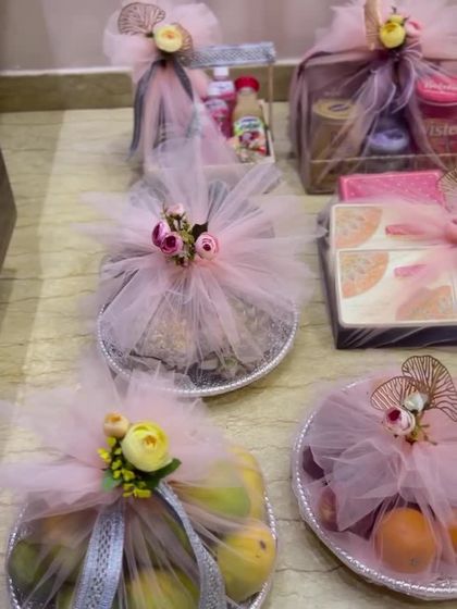 I transform your bridal essentials into beautifully arranged, Instagram-worthy displays. I use a variety of materials like elegant trays, net fabric, and floral accents to ensure your trousseau is not just organized, but a memorable part of your wedding story.