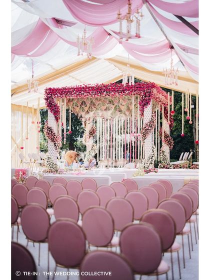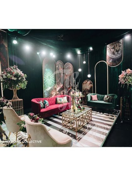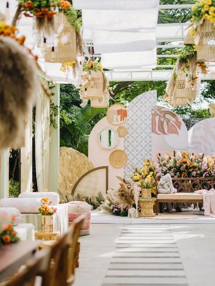 We create relaxed and stylish Mehendi ceremonies that blend free-spirited boho aesthetics with soft pastel hues. These sundowner events feature flowing printed drapes, hanging baskets, informal lounge seating with rattan and jute, and backdrops with abstract shapes and prints for a picture-perfect setting.