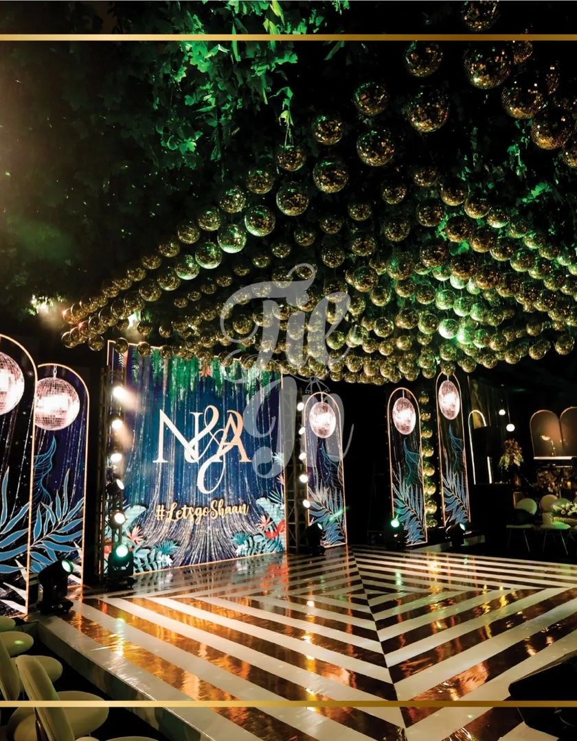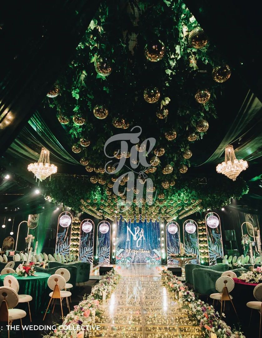We transported guests to a tropical realm of animal royalty and opulent glamour for this Sangeet. The design combines a moody palette of green and wine with gold accents, featuring custom-fabricated elements like a glass aisle with fairy lights, a 24-foot U-shaped bar with a neon tiger, and a ceiling filled with hundreds of gold mirror balls.