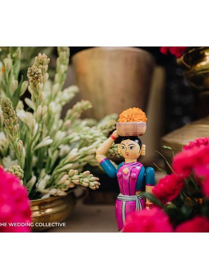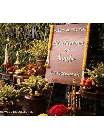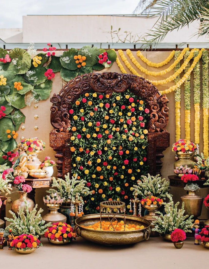 We design Haldi ceremonies that are a beautiful blend of antiquity and contemporary style, deeply rooted in South Indian culture. Our designs often feature antique finds like a magnificent Prabhavali, traditional brassware, vibrant marigolds, and playful Channapatna toys for a colourful and joyous kickoff to the wedding festivities.
