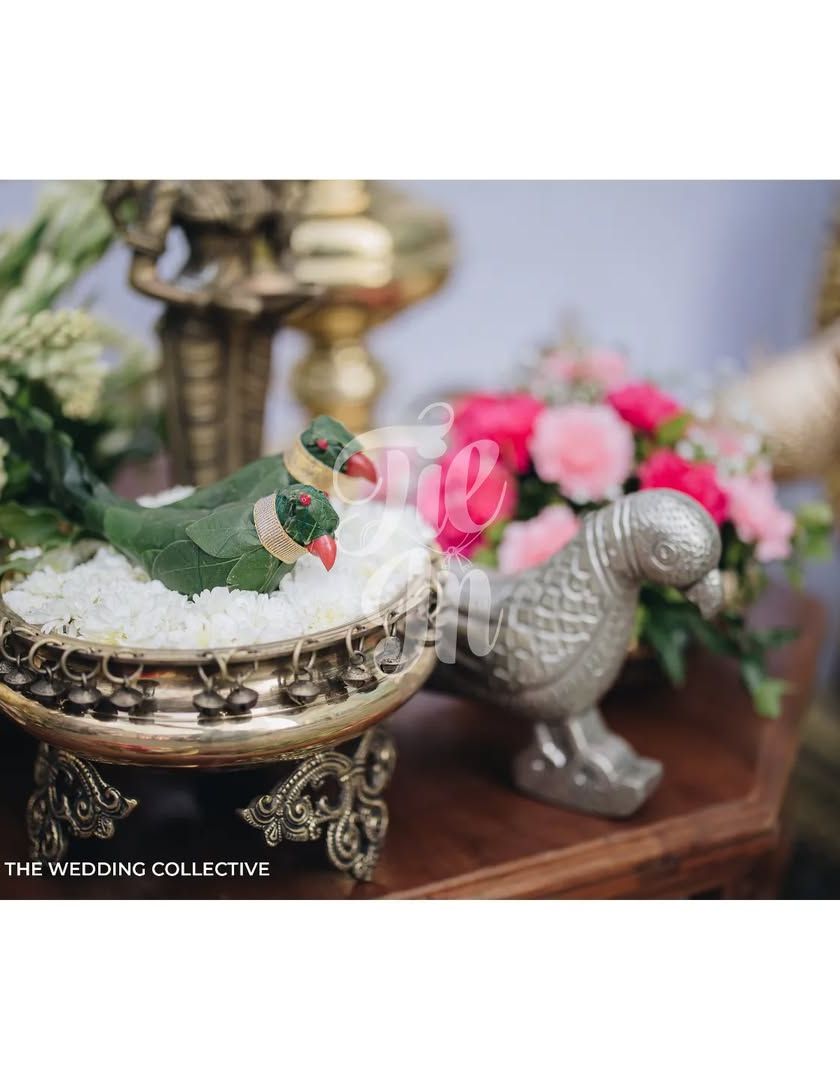 For this Muhurtham, we drew inspiration directly from the bride's radiant pink Kanchivaram saree. The design features intricate geometric patterns from the saree's border, a soft pastel palette of pink, white, and gold, and personalized details like playful parrot accents and the bride's favorite roses.