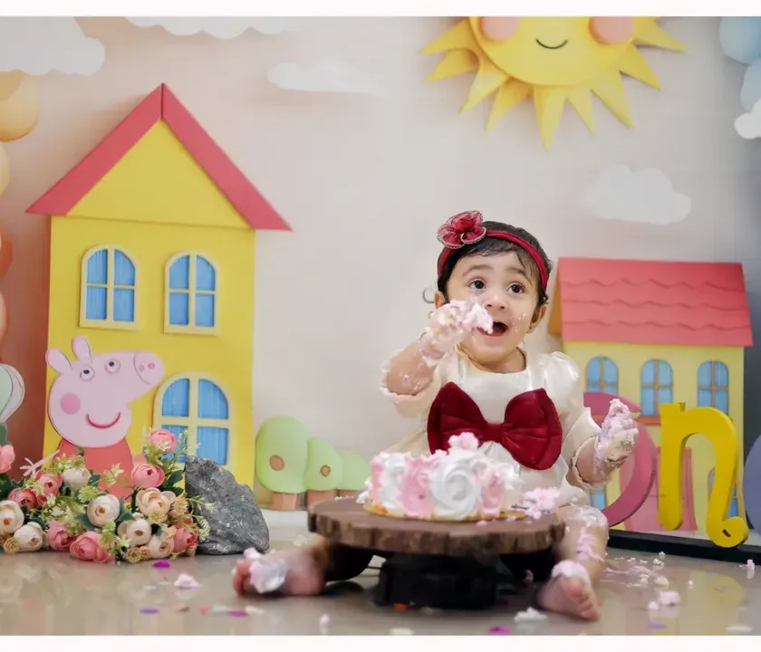 We capture the joy of your child's biggest milestones, from their first birthday cake smash to other special ages. Our studio provides fun and colorful setups with props like 'ONE' signs, balloons, and themed backdrops to make the celebration memorable.