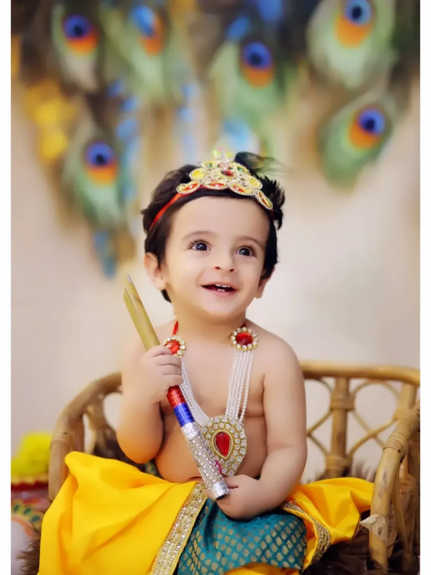 We specialize in vibrant Janmashtami photoshoots, creating divine portraits of your little ones as Krishna or Radha. Our sessions include a variety of traditional costumes, peacock feather backdrops, and classic props like flutes and matkis for an authentic feel.
