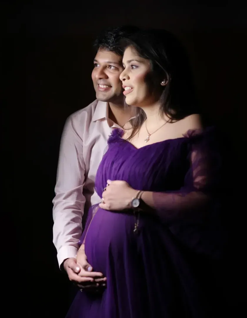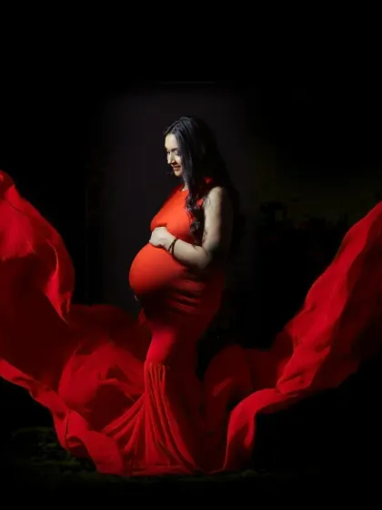 This is for those who want to feel like a star. We provide a wide selection of maternity gowns, including dresses with long flowing trails, satin fabrics, and elegant ruffles to create stunning, high-fashion portraits in our studio. We use dramatic lighting and creative techniques to make you shine.