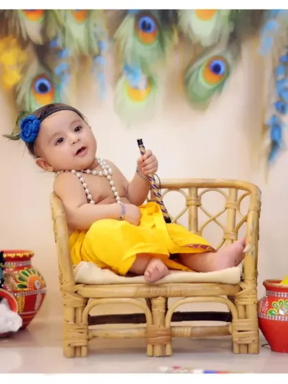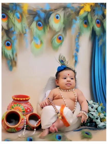 My Little Krishna themed photoshoots are a popular choice for celebrating your baby's arrival. I provide complete setups with multiple backdrops, including peacock feathers and swings with marigolds, along with all costumes and props like flutes, matkas, and pearl necklaces.