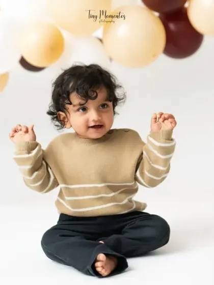 Perfect for babies aged 6 to 9 months, sitter sessions freeze this adorable stage of wobbly sits, curious crawls, and infectious giggles. I use a variety of simple props and backdrops, from minimalist balloon setups to charming floral arrangements, to let your baby's budding personality shine.