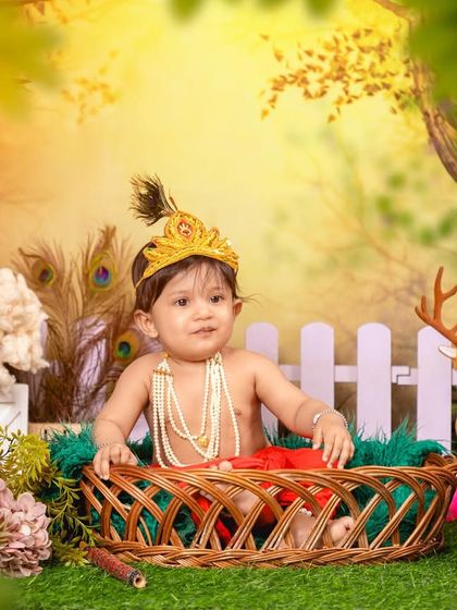 My studio’s got props for everything - from tiny Krishna to Santa, enchanted garden arches, or just keeping it simple and classic. Themed baby photoshoot is my jam, but sometimes, less is more and I love those clean, timeless portraits too.