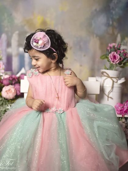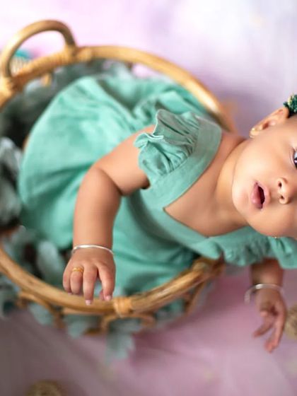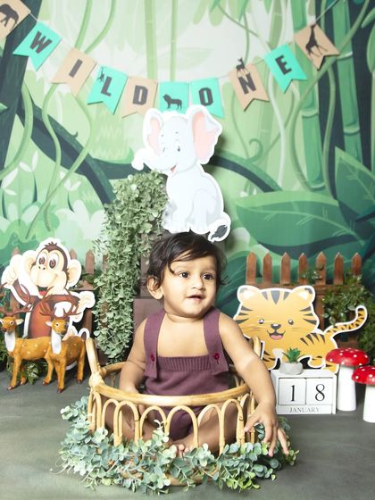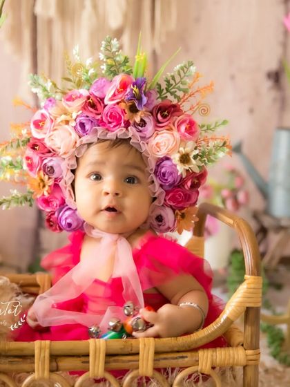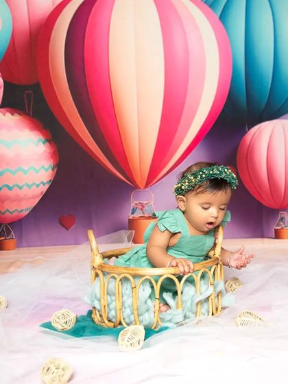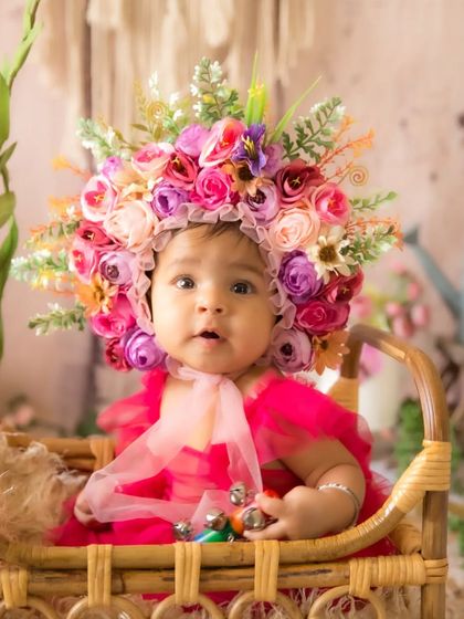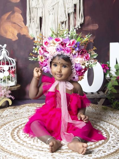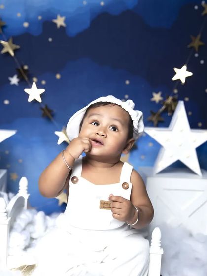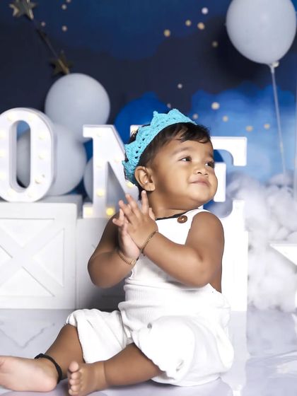 We capture milestone photos of babies and kids at our Kasturi Nagar studio with ready themes, props, and outfits so you just bring your child and choose the setup.
