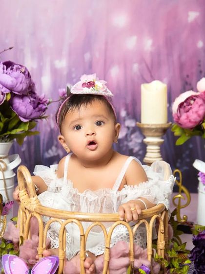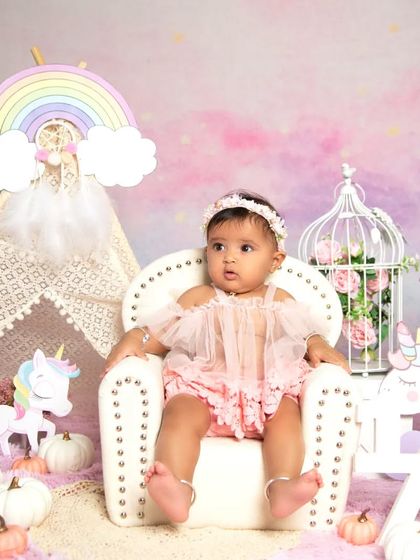 I capture that special stage when your baby can sit up but isn't crawling yet, full of personality and adorable expressions. These sessions, including the popular half-birthday milestone, are styled with unique themes and outfits from my studio wardrobe.