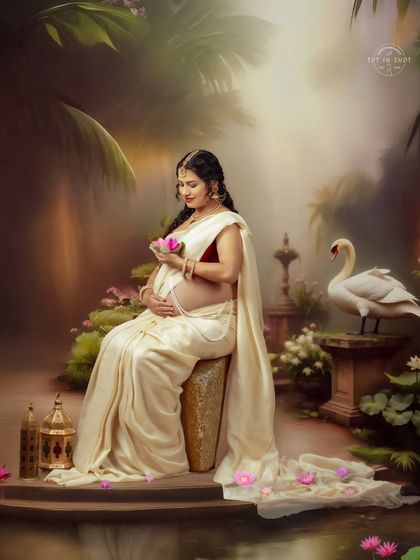 We specialize in capturing the grace of motherhood through culturally-rich traditional photoshoots. Our sessions feature elegant Indian attire like sarees, complemented by gold jewelry and traditional props including lamps and musical instruments. Each shoot is set against ornate backdrops creating a warm, classic atmosphere.