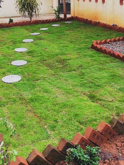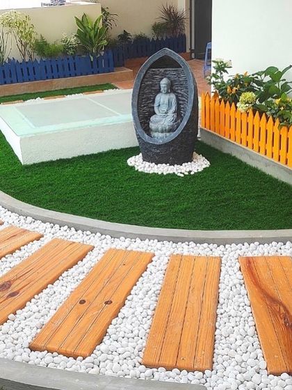- Patio and backyard landscaping with artificial grass, stepping stones