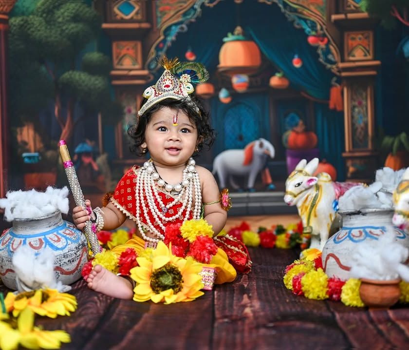 I absolutely love creating themed photoshoots for Indian festivals. My Krishna Janmashtami setups are very popular, but I also design special concepts for Shivaratri, Rama Navami, and more. I have a wide range of costumes, backdrops, and props to bring these divine themes to life for your child.