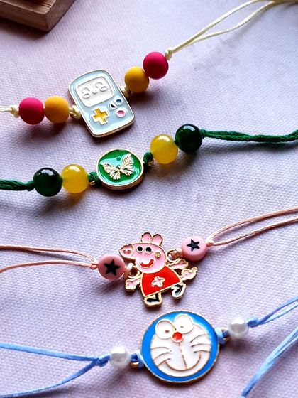 We make handmade Rakhis that double as bracelets, offer cartoon bands for kids, matching Bhai-Bhabhi sets, custom designs, and ready-to-gift hampers, all personalized and wearable after Raksha Bandhan.