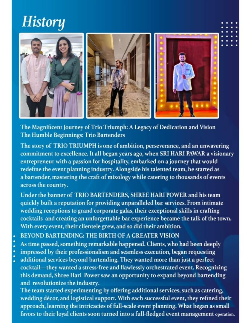 My journey began with Trio Bartenders, where a passion for perfection was born, and evolved into Trio Triumph, a comprehensive planning service for events and travel. This history is built on a foundation of dedication and a commitment to executing every detail flawlessly for over 2,000 successful events.