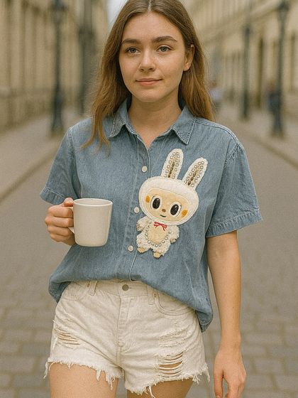 Denim Shirts - Short-sleeved, with big Labubu patches. Some even have sequins, so they pop when you wear them. They aren't for everyone, but if you like your style to stand out, these are fun.