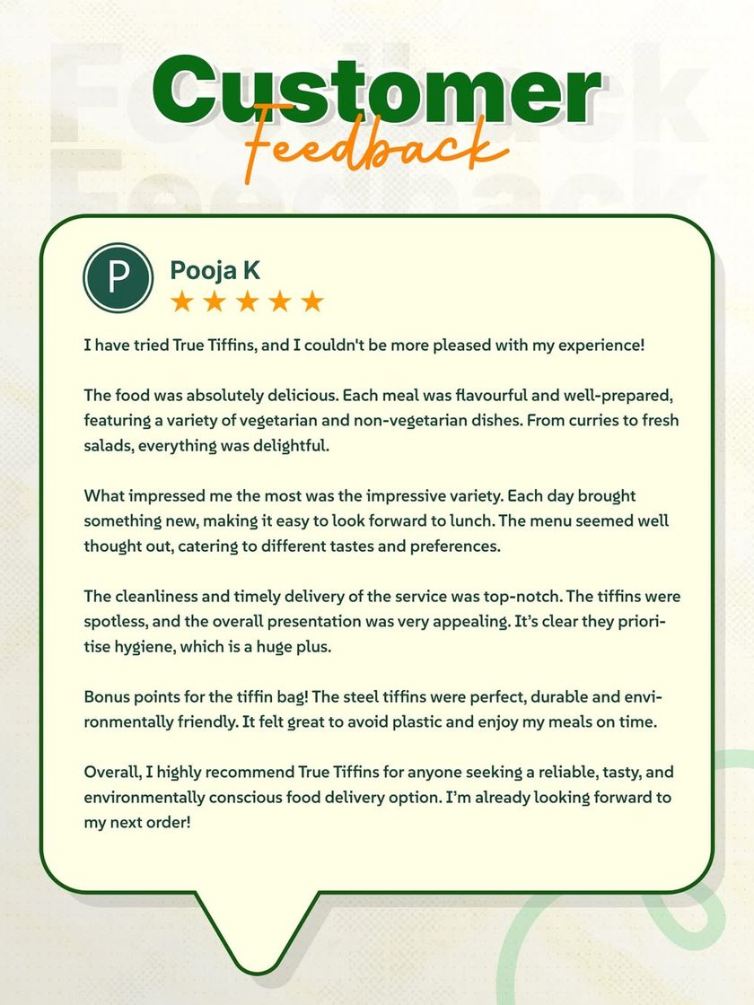 The best compliment is an empty tiffin and a happy message. Here’s what our customers have to say about their daily meals. Their trust means everything to us.