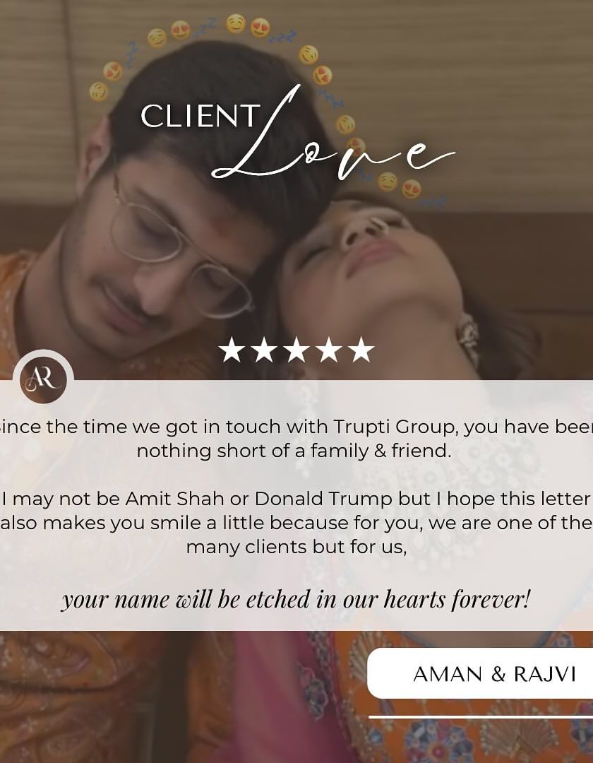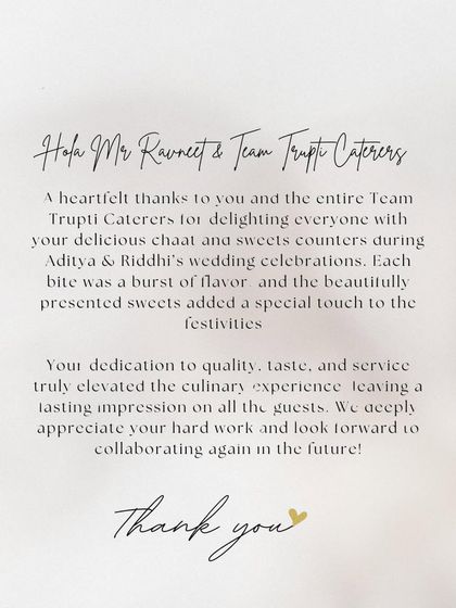 Nothing makes me happier than seeing the joy our food brings to a celebration. The smiles on our clients' faces and their heartfelt words are the biggest reward for our hard work. Here’s what some of our wonderful clients have to say about their Trupti experience.