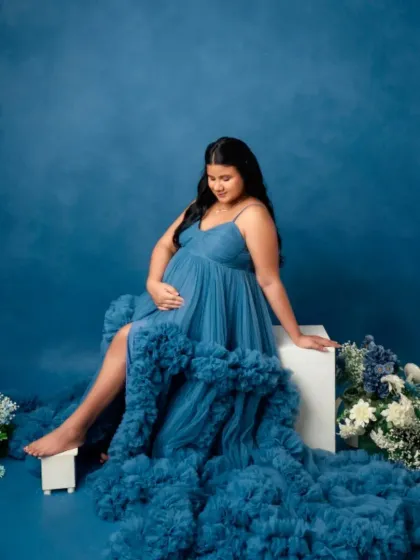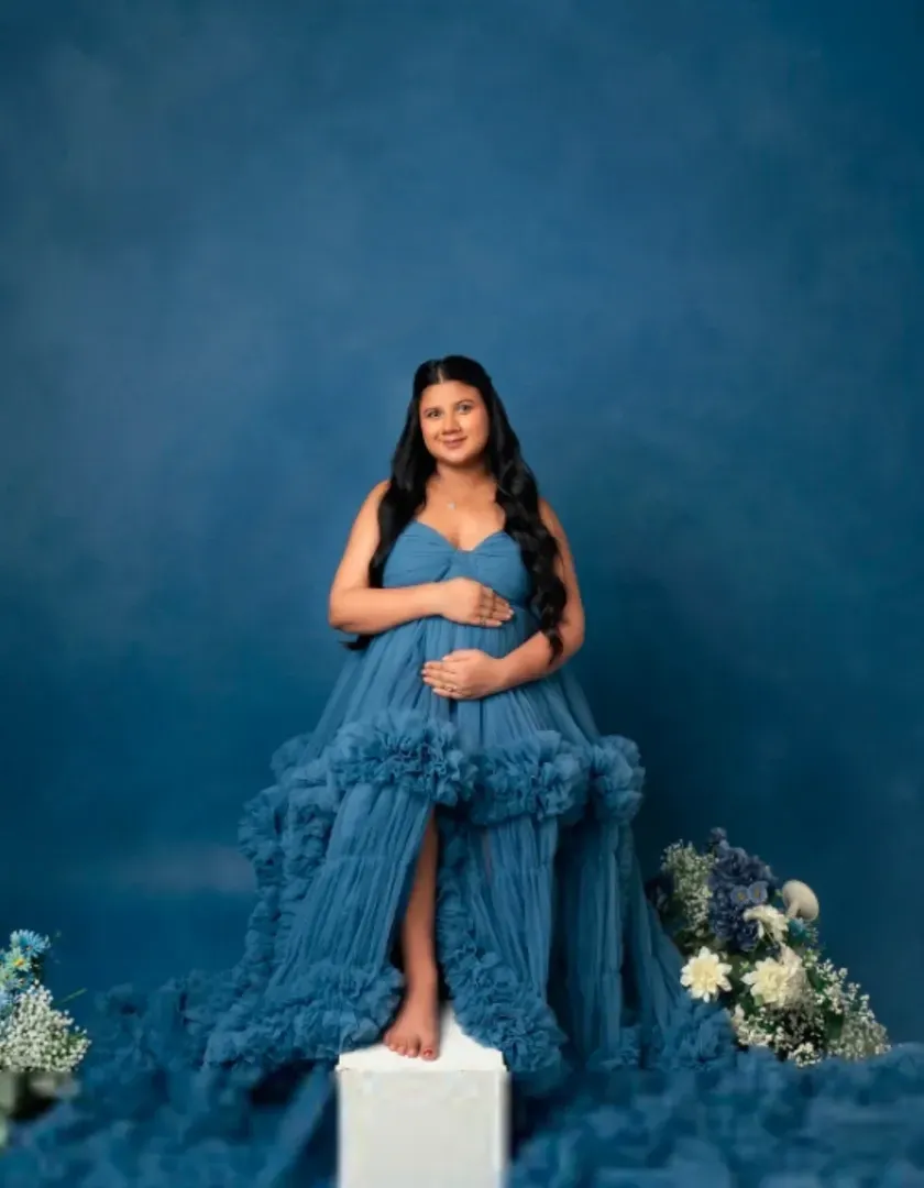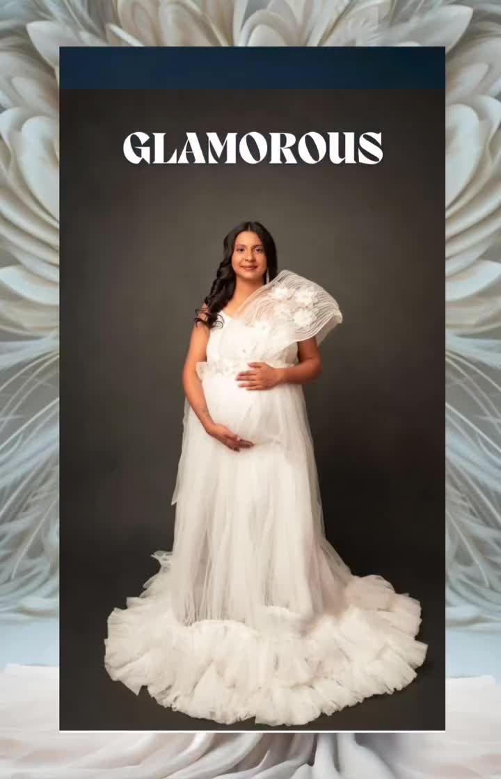 Live out your fairytale dreams with our collection of dramatic tulle gowns. These dresses feature layers of soft, flowing fabric, magnificent trains, and romantic ruffles, designed to make you feel like royalty for your maternity shoot or baby shower.