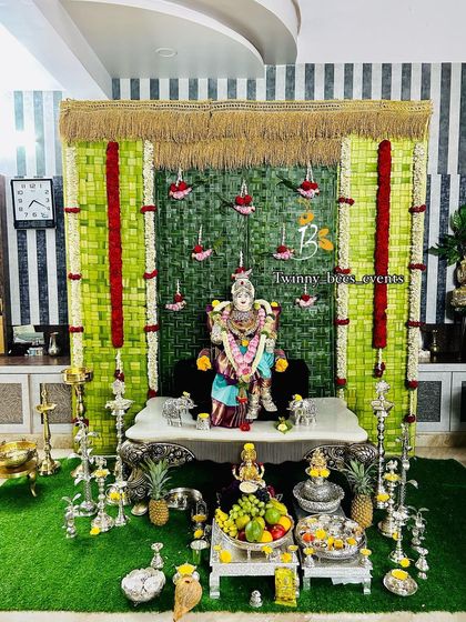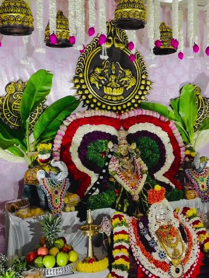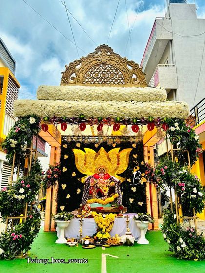 We specialize in creating beautiful mantaps for home pujas like Varamahalakshmi, Navaratri, and Gruha Pravesha. We use a mix of dense floral arrangements, traditional elements like lotus motifs, and eco-friendly materials for a divine atmosphere.