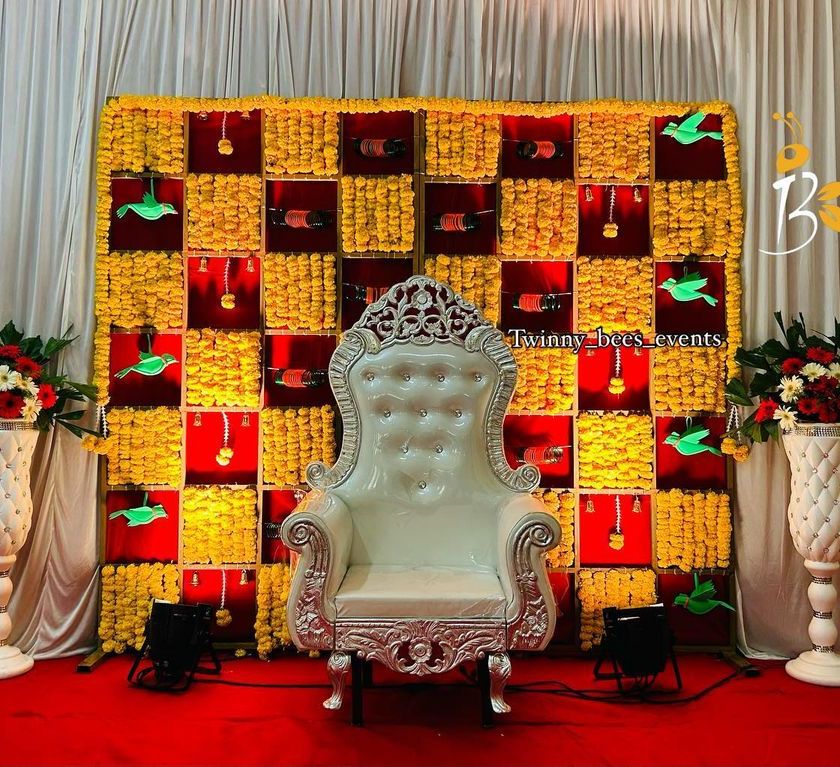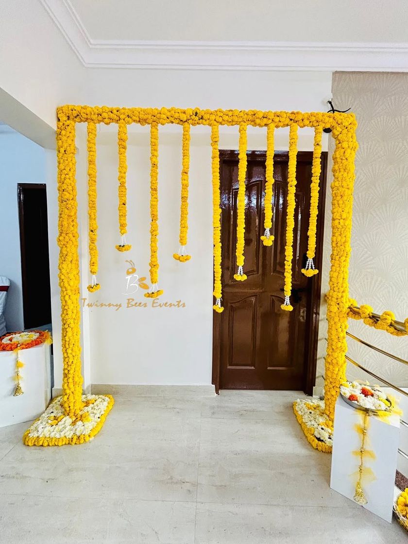 We create bright and cheerful backdrops perfect for your Haldi ceremony. Choose from classic marigold flower walls and arches or opt for a traditional South Indian look with fresh banana leaf backdrops and brass urlis.