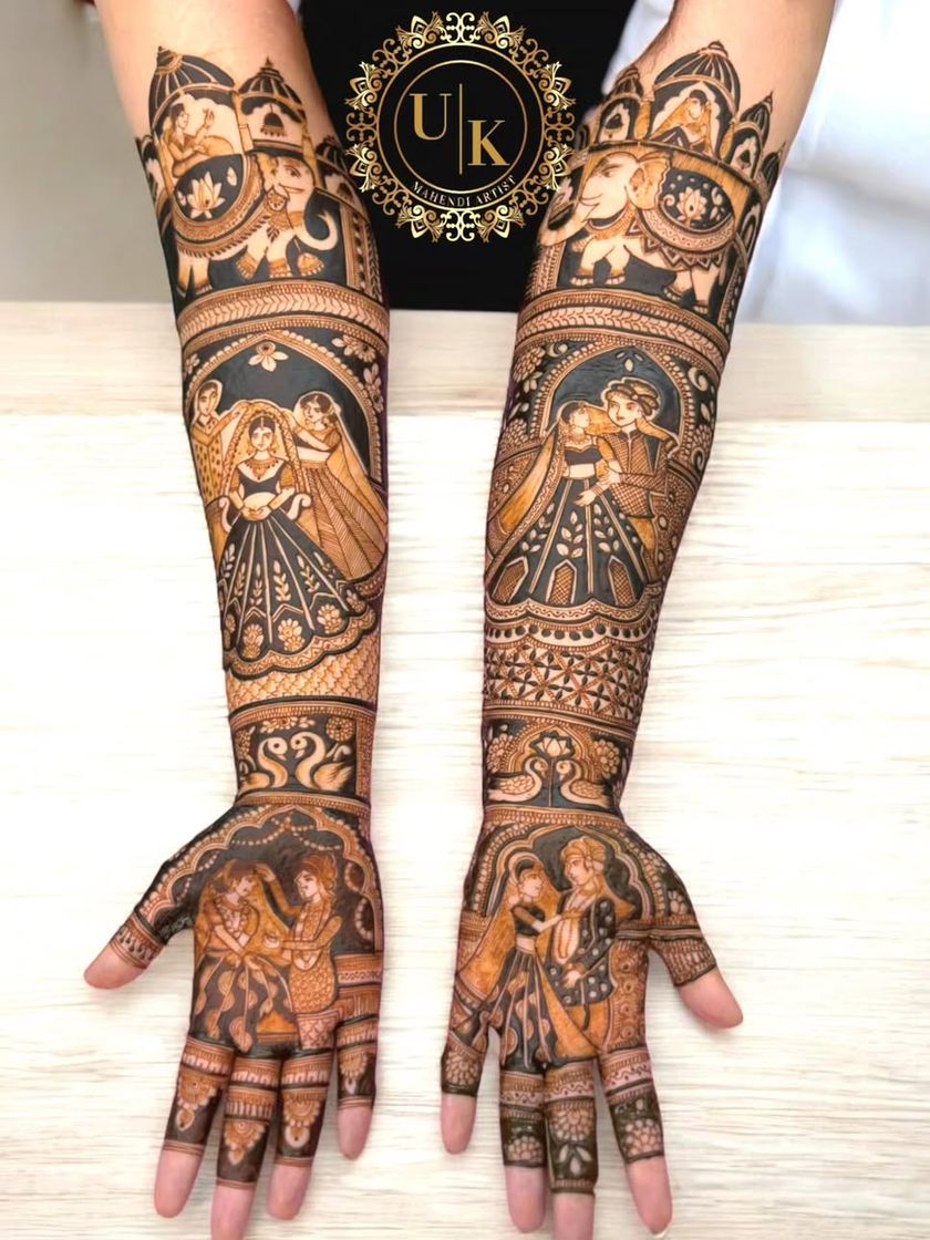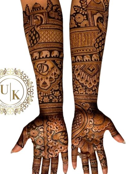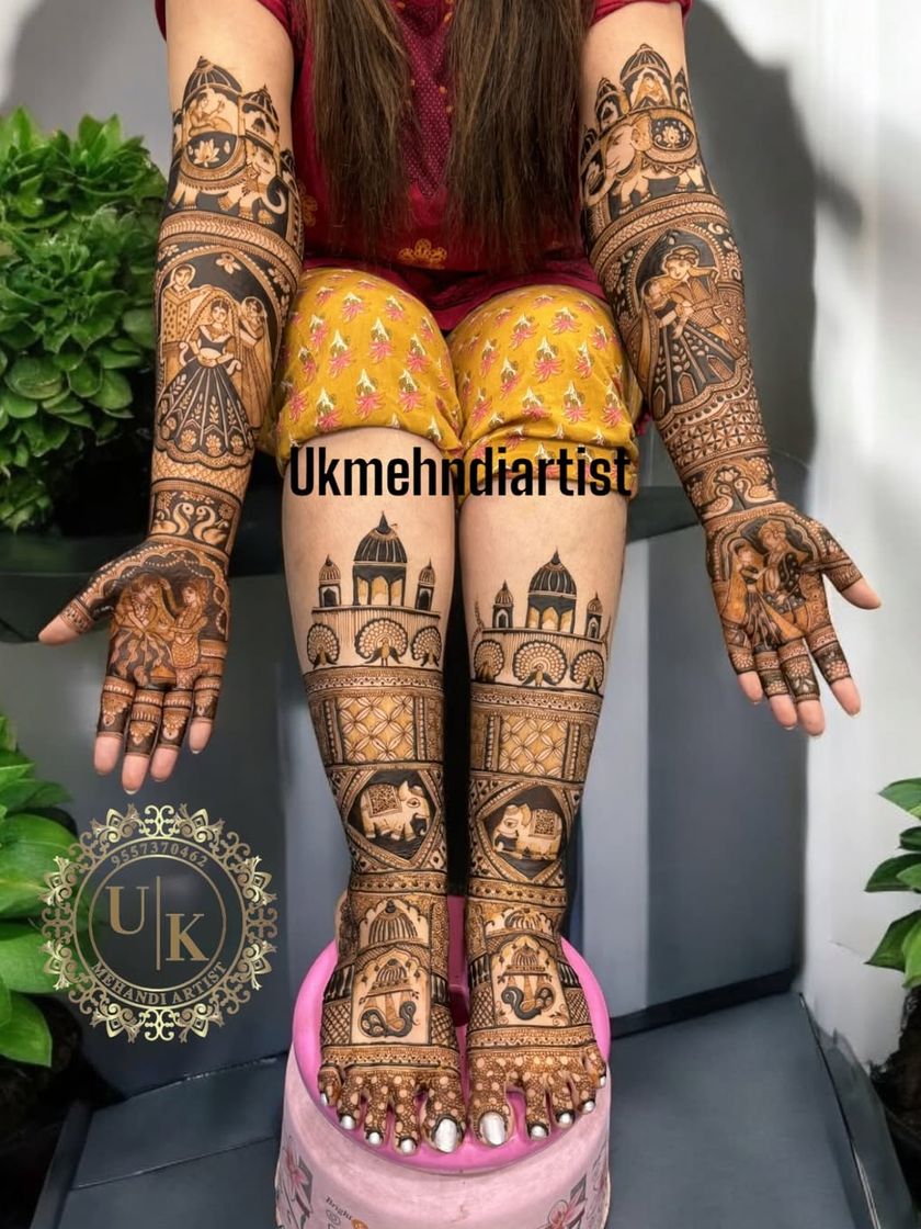 This is where I showcase my most detailed and elaborate work for the bride's big day. You'll find full coverage designs that extend up the arms and legs, combining many traditional elements for a truly grand statement.
