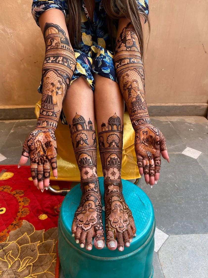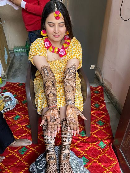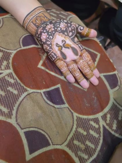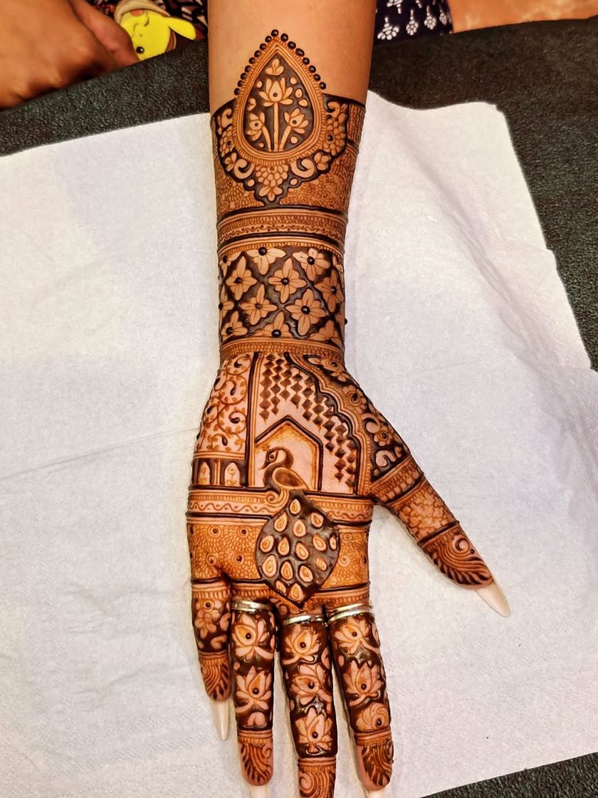 For those who love the classics, I create intricate and fine-line Rajasthani and Marwadi mehandi. These designs are dense with traditional motifs like peacocks, paisleys, elephants, and delicate check patterns, covering the hands and feet beautifully.