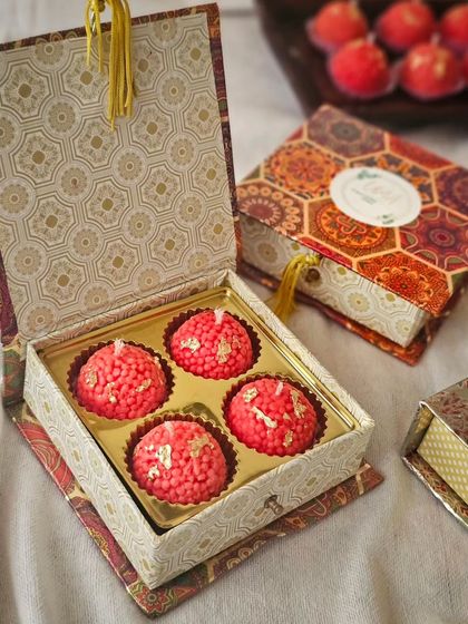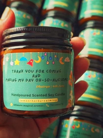Some samples: 100 rose tin candles for a first birthday, 80 crystal candles plus 40 car fresheners for a brand partner, 55 custom jars for party favors, 15 motichoor ladoo candles for festive gifts.