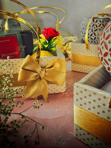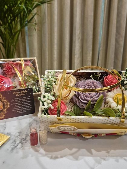 We create personalized gift hampers that combine our handcrafted scented candles with thoughtful additions. Our Floral Box Hampers include floral candles, decorations, roli chawal, and rakhi with customizable message cards. We also offer Candle Gift Baskets featuring wax warmers, wax melts, and jar candles.