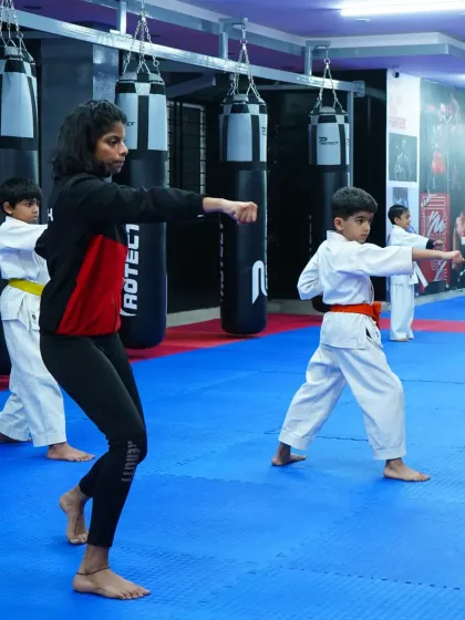 Our kids' classes are designed to be fun, engaging, and packed with energy. We focus on building core life skills like discipline, respect, and confidence through karate fundamentals, agility drills, and positive reinforcement.