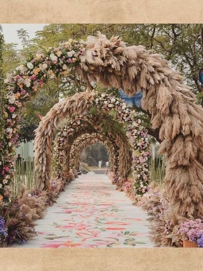 - Backdrop: Premium multi-layered setup with artificial floral walls, hanging wisteria, or sequin "Glam" panels with crystal chandeliers.