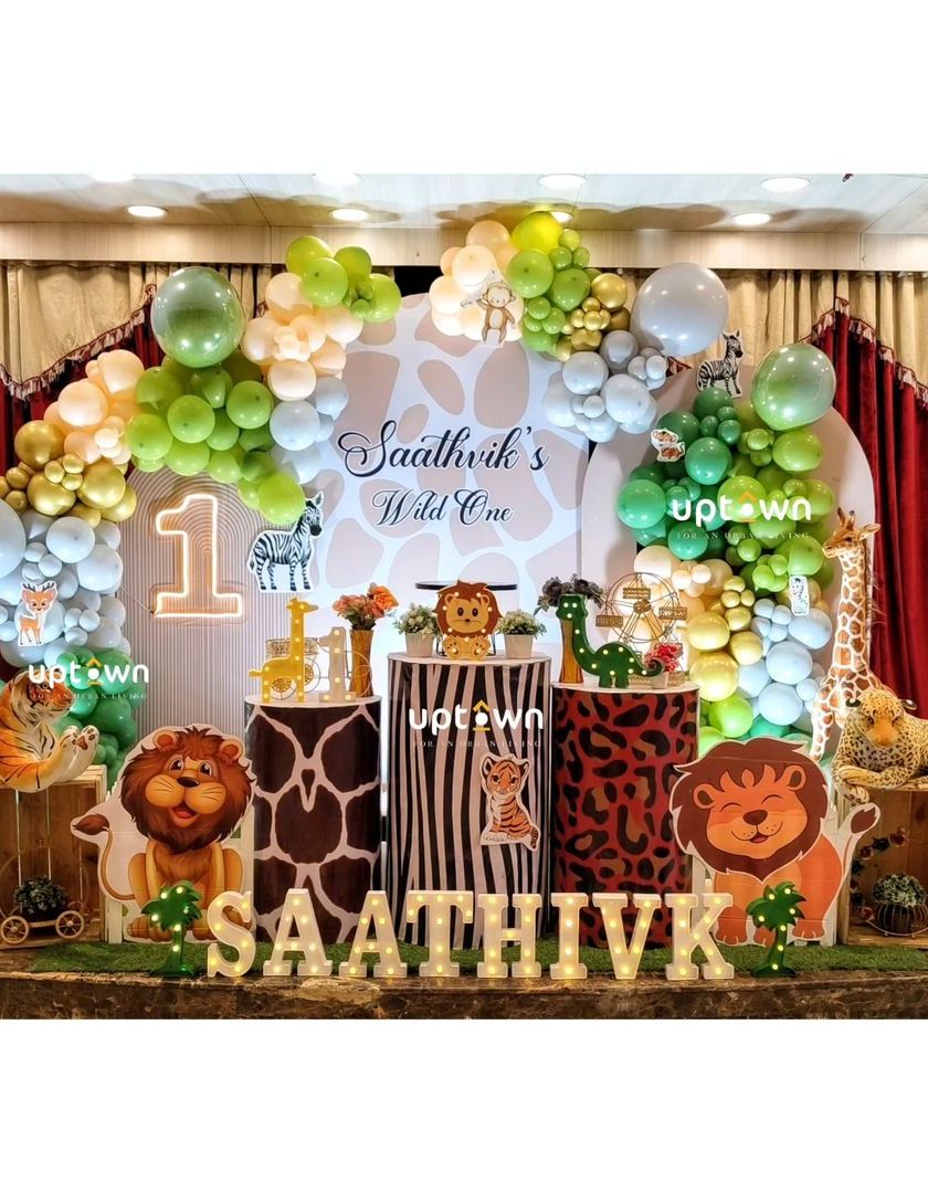I create wild adventures with my popular jungle and animal safari themes. These setups are perfect for kids who love animals, featuring everything from lion and elephant cutouts to animal print details and lush green backdrops, making it a birthday to remember.